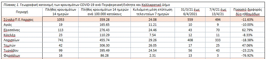 Ο παρακάτω πίνακας αποτυπώνει τη γεωγραφική κατανομή των κρουσμάτων, την κυλιόμενη μέση επίπτωση (ανά 100.000 κατοίκους) των τελευταίων 7 ημερών και το ποσοστό διαφοράς των κρουσμάτων μεταξύ των δύο προηγούμενων εβδομάδων ανά Καλλικρατικό Δήμο του νομού Λάρισας, με βάση την δηλωθείσα διεύθυνση μόνιμης κατοικίας του κρούσματος ή τη διεύθυνση προσωρινής διαμονής για τους τουρίστες και άλλους προσωρινά διαμένοντες στην Ελλάδα. Συμπεριλαμβάνονται τόσο κρούσματα με ιστορικό ταξιδίου (“εισαγόμενα”) όσο και κρούσματα με πιθανή εγχώρια μετάδοση.