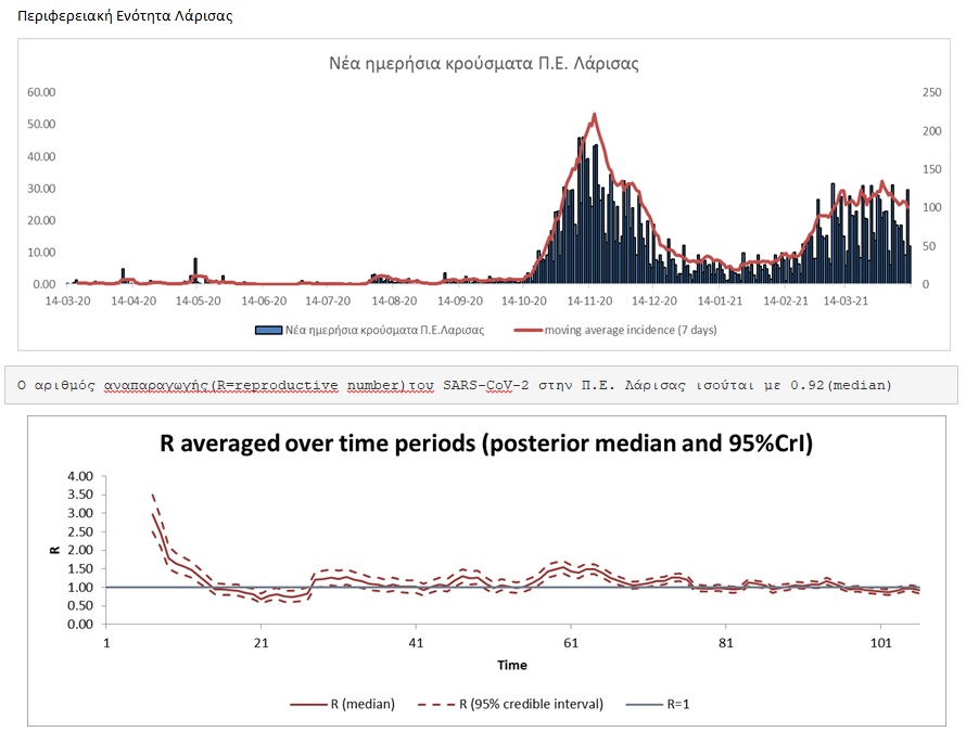 Παρακάτω παρουσιάζεται η ημερήσια κατανομή των επιβεβαιωμένων κρουσμάτων και ο αριθμός αναπαραγωγής R (R=reproductive number) για την Περιφέρεια Θεσσαλίας, όπως καταγράφονται στην Επιδημιολογική Έκθεση του Εργαστηρίου Υγιεινής και Επιδημιολογίας του Πανεπιστημίου Θεσσαλίας. Μαζί με την επιδημική καμπύλη παρουσιάζεται και ο κυλιόμενος μέσος όρος επίπτωσης του νοσήματος COVID-19 των τελευταίων 7 ημερών (moving average incidence).