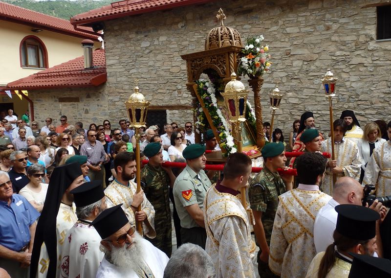 Λίγο πριν τις 11 το πρωί, και με φόντο το πράσινο τοπίο του Ολύμπου, έγινε η καθιερωμένη περιφορά της Ιερής Εικόνας(την υποβάσταζαν τιμητικά οπλίτες – καταδρομείς του ΚΕΟΑΧ Ολύμπου) γύρω από το μοναστήρι. Η λιτάνευση της Εικόνας κατέληξε στο αίθριο, στη Φιάλη της Μονής, όπου αναπέμφθηκε δέηση.