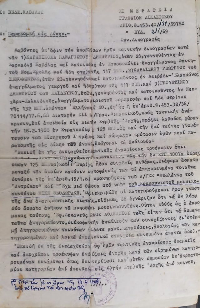 Το παραπεμπτικό πόρισμα του Στρατοδικείου δεν άφηνε περιθώρια: Ο Ελασσονίτης μαζί με άλλους στρατιώτες, υπό τη συνοδεία κιθάρας, τραγουδούσαν «διάφορα άσματα, μεταξύ των οποίων κατόπιν αποφάσεως τα απαγορευμένα «Μπαλάντα του Αντρίκου» και «Έχω μία θάλασσα στο νου» του κομμουνιστού μουσικοσυνθέτου Μίκη Θεοδωράκη».