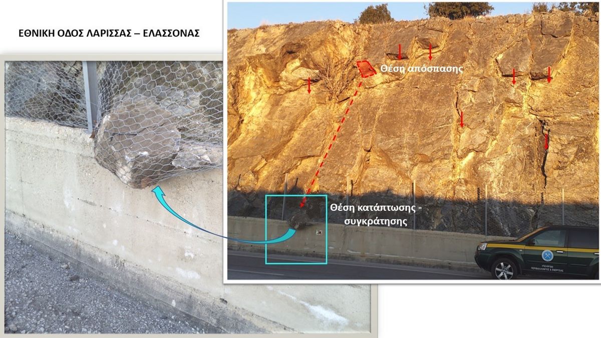 • Στη θέση Μελούνα, νέα εθνική οδός Λάρισας-Ελασσόνας παρατηρήθηκαν καταπτώσεις κατακερματισμένων και έντονα τεκτονισμένων μαρμάρων από ύψη πρανούς μεταξύ 5-30 μέτρων λόγω του σεισμικού γεγονότος. Οι βραχομάζες που αποσπάστηκαν δεν δημιούργησαν πρόβλημα στο οδικό δίκτυο αφού τα μέτρα προστασίας λειτούργησαν ικανοποιητικά και δεν αποκλείσθηκε η εθνική οδός (Εικ.1).