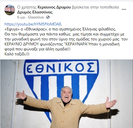 Αναλυτικά η ανάρτηση: «Έφυγε» ο «Εθνικάρας», ο πιο αγαπημένος Έλληνας φίλαθλος. Θα τον θυμόμαστε για πάντα καθώς μας τίμησε και συμμετέχει με την μοναδική φωνή του στον ύμνο της ομάδας του χωριού μας τον ΚΕΡΑΥΝΌ ΔΡΥΜΟΥ φωνάζοντας “ΚΕΡΑΥΝΑΡΑ” Ήταν η μοναδική φορά που φώναξε για άλλη ομάδα!!!