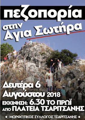 Πεζοπορία στην Αγιά Σωτήρα διοργανώνει ο Μορφωτικός Σύλλογος Τσαριτσάνης την Δευτέρα 6 Αυγούστου.Η εκκίνηση ορίστηκε για τις 6:30 το πρωί από την Κεντρική πλατεία Τσαριτσάνης.
