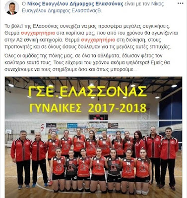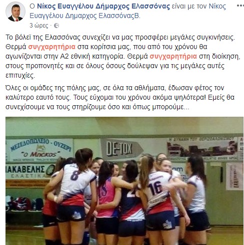 Με ανάρτηση στο facebook, o Δήμαρχος Ελασσόνας Νίκος Ευαγγέλου, συγχαίρει τη γυναικεία ομάδα του ΓΣΕ Ελασσόνας για την άνοδο στην Α2′ Εθνική κατηγορία.