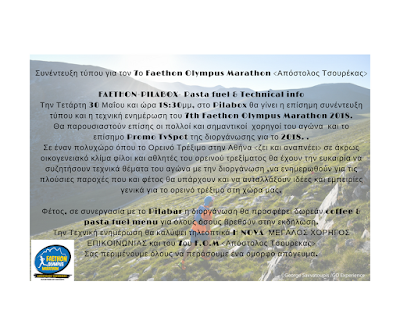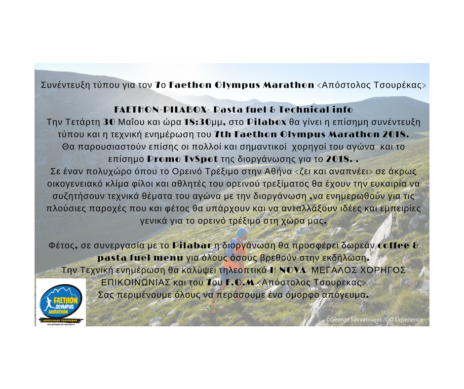 Την Τετάρτη 30 Μαΐου στις 6:30 το απόγευμα στο Pilabox θα γίνει η επίσημη συνέντευξη τύπου και η τεχνική ενημέρωση του 7th Faethon Olympus Marathon 2018.