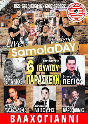 Η Δόξα Βλαχογιαννίου διοργανώνει χοροεσπερίδα την Παρασκευή 6 Ιουλίου, για διασκέδαση μέχρι το πρωί με το συγκρότημα “SamolaDAY” (Σαμολαδαίων) και την ορχήστρα του Βαγγέλη Πέγιου.