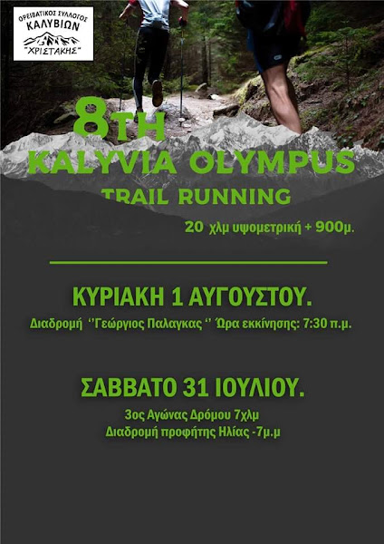 Ο Ορειβατικός Σύλλογος Καλυβίων “ο Χριστάκης” διοργανώνει από τις 31 Ιουλίου ως τη 1 Αυγούστου ορεινό αγώνα με την ονομασία 8ος Kalyvia Olympus Trail Running.
